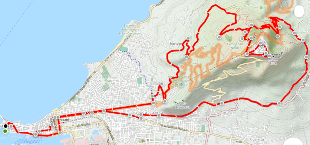 Zunächst muss das Stadtzentrum von Trapani durchfahren werden, bevor die vorgeschlagene Route der Landstraße entlang des Südhangs des Berges folgt. Ganz oben kann man bereits die mittelalterliche Befestigung des Berggipfels erkennen: